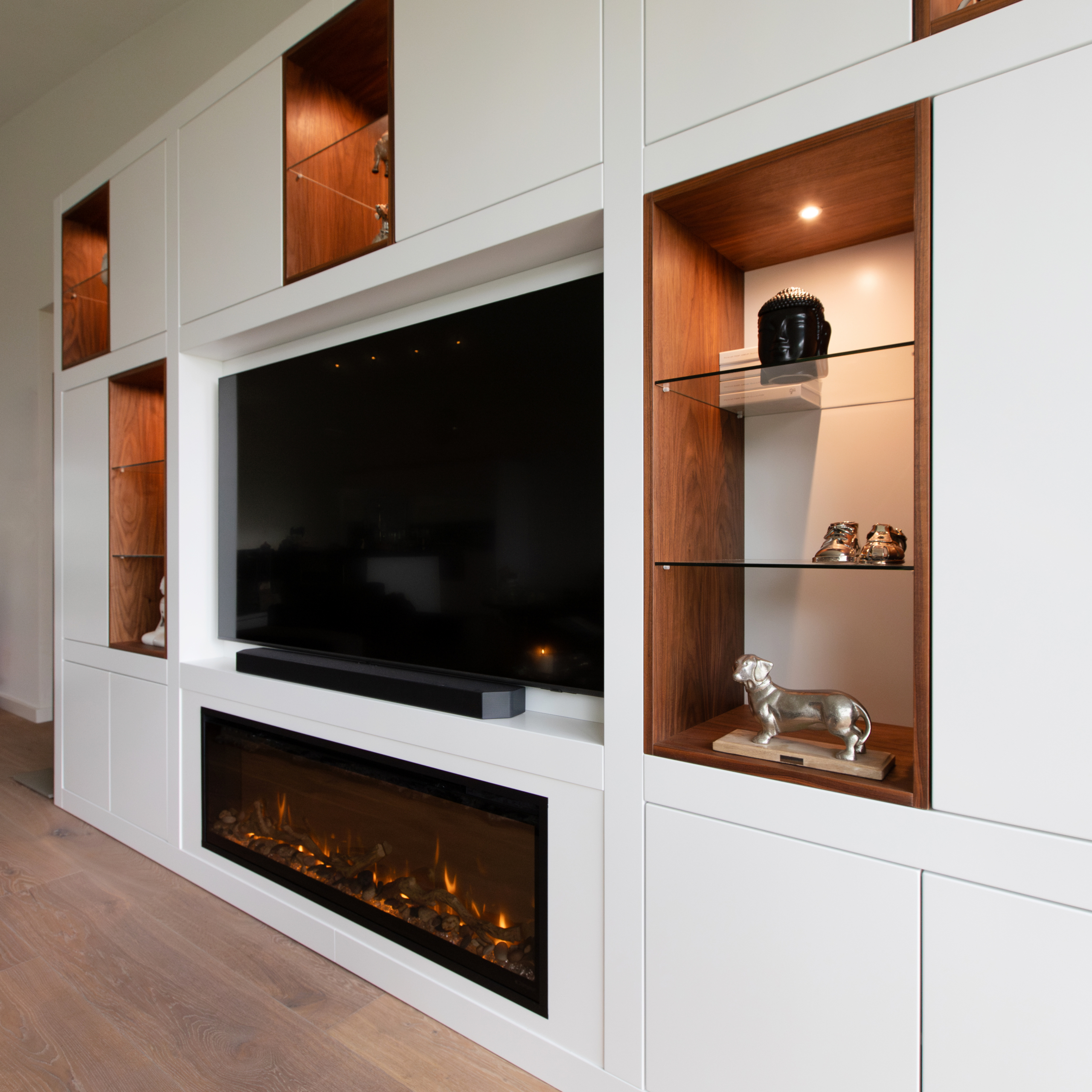 Deze maatwerk wandkast brengt het beste van techniek en design samen. Het strakke witte MDF vormt een rustig kader, terwijl de warme accenten van notenhout de vitrines een luxueuze uitstraling geven. Achter de fronten zijn alle apparaten en bekabeling netjes weggewerkt, zodat het geheel strak oogt. De volledig dimbare, warmwitte spotjes zorgen voor sfeervolle verlichting in elk vak – ideaal om persoonlijke objecten extra uit te laten komen. Centraal zijn de televisie en een ingebouwde elektrische haard geplaatst, waardoor deze kast zowel het functionele als het gezellige middelpunt van de woonkamer is.